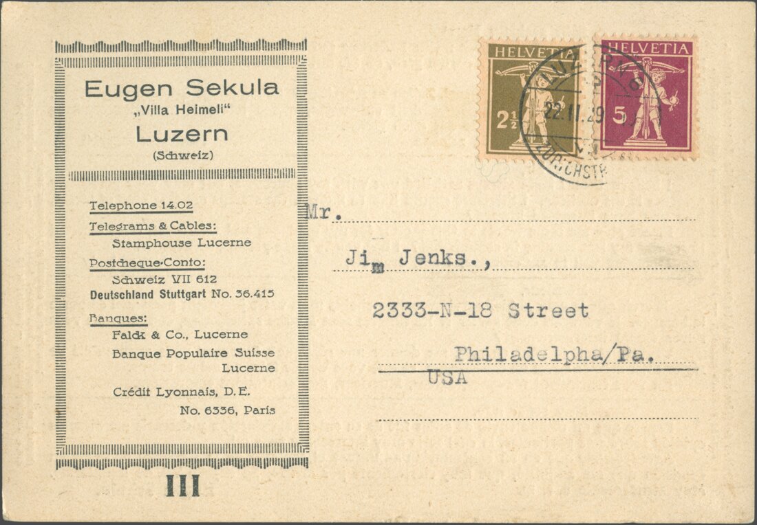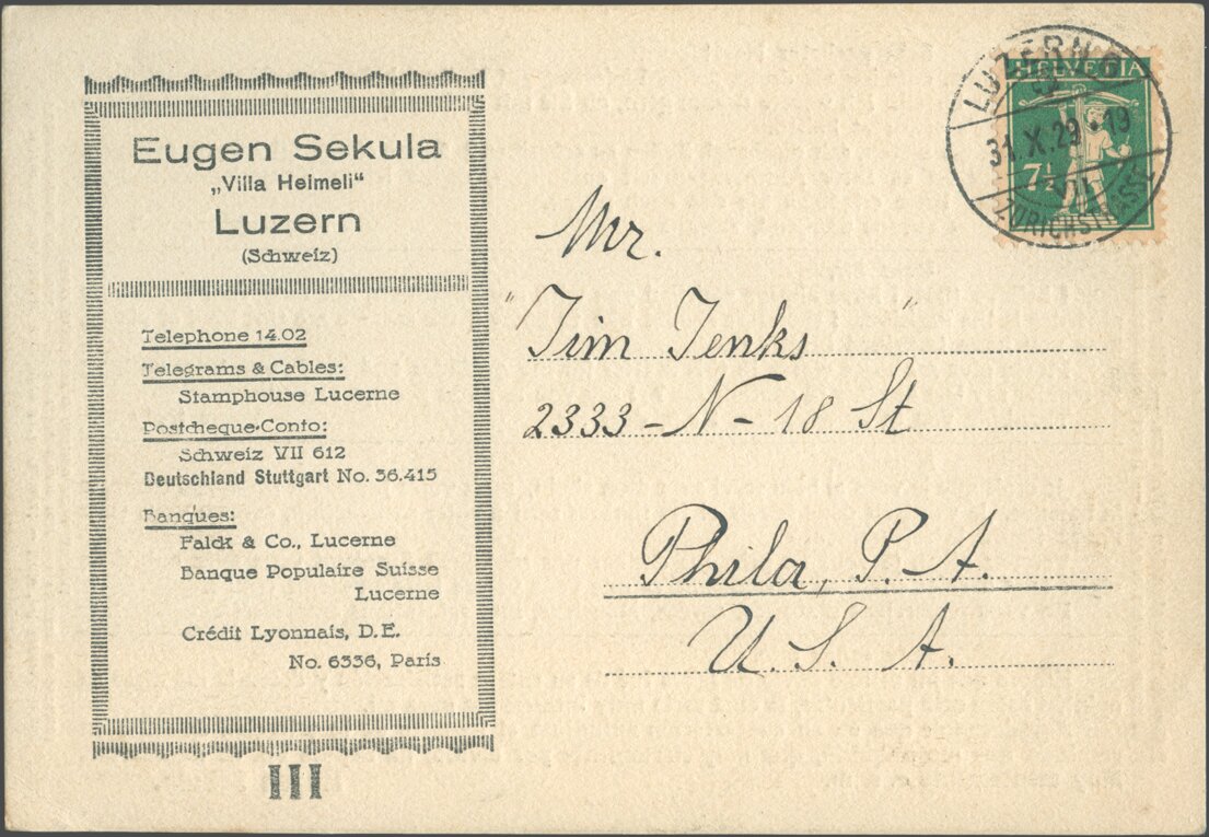 Im September 1919 schloss Eugen sein Geschäft in der Grendelstraße 19 und eröffnete es als Briefmarken-Import und -Exporthaus an der neuen Adresse Hertensteinstraße 56.