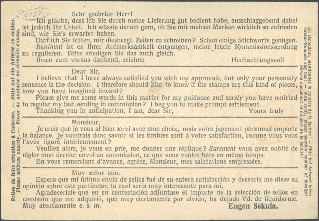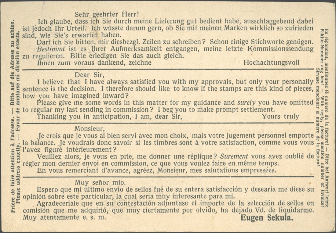 Infolgedessen wandelte Eugen seine Briefmarken-Import- und -Exportfirma im August desselben Jahres um in die Aktiengesellschaft Eugen Sekula AG, Dreilindenstr. 47, mit sich selbst als Direktor.
