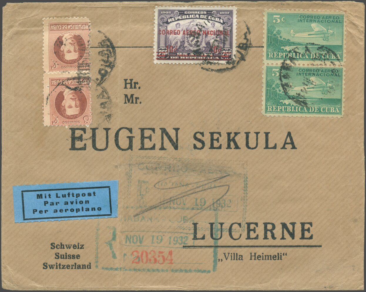 Einschreiben abgeschickt am 18. Oktober 1938, von Zürich, Schweiz, nach Lewisburg, Pennsylvania, Vereinigte Staaten. Angekommen am 26. Oktober 1938.