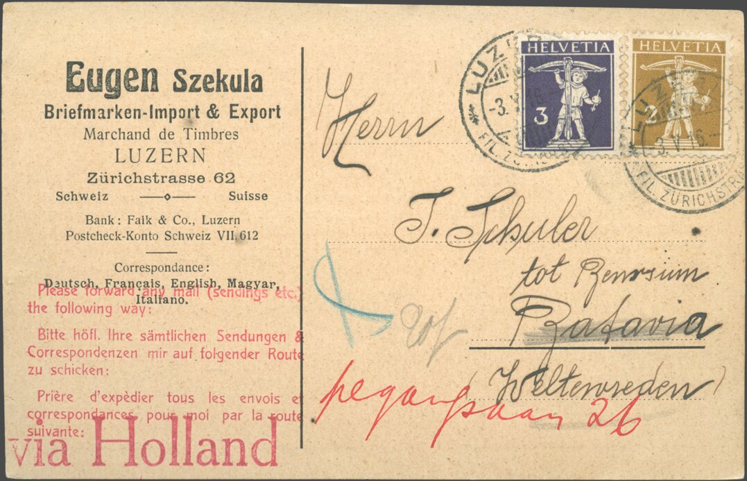 Sent on May 3, 1916, from Lucerne, Switzerland, to Weltevreden, Batavia (today part of Jakarta), Dutch East Indies (today Indonesia).