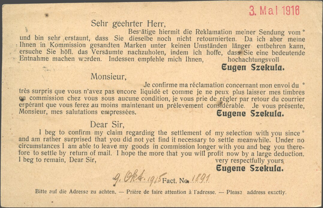 In September 1916 he moved to Grendelstr. 19, where he opened his own Briefmarken-Import und -Export (= stamp import and export) business Eugen Szekula in January 1917.