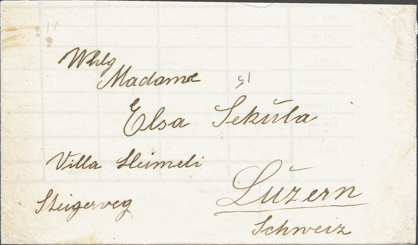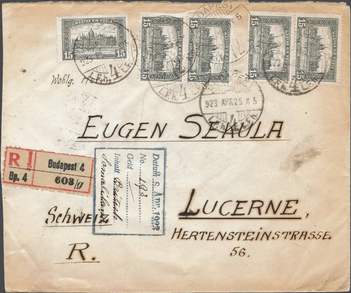 Sent on February 15, 1921 with shipment from Leipzig, Germany, to Eugen Szekula in Lucerne.