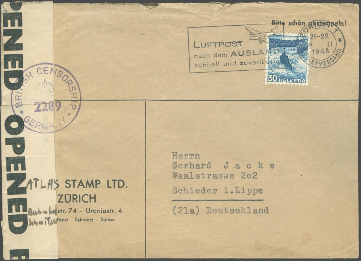 Sent on February 4, 1948, from Zurich, Switzerland, to Schieder (today part of Schieder-Schwalenberg), Germany.