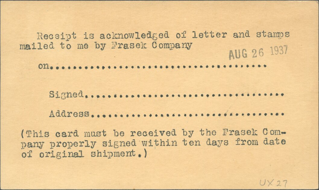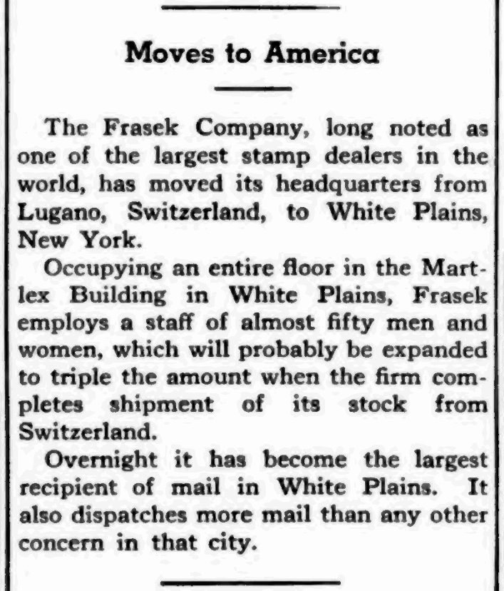 A trade note that appeared in various philatelic magazines and daily newspapers hinted at the future size of the company: The Frasek company, long known as one of the larger stamp dealers of the world, has moved its headquarters from Lugano, Switzerland, to White Plains, N. Y. At present the company employs a staff of almost fifty men and women and will require perhaps triple that number when it completes the shipment of its stock from Switzerland.