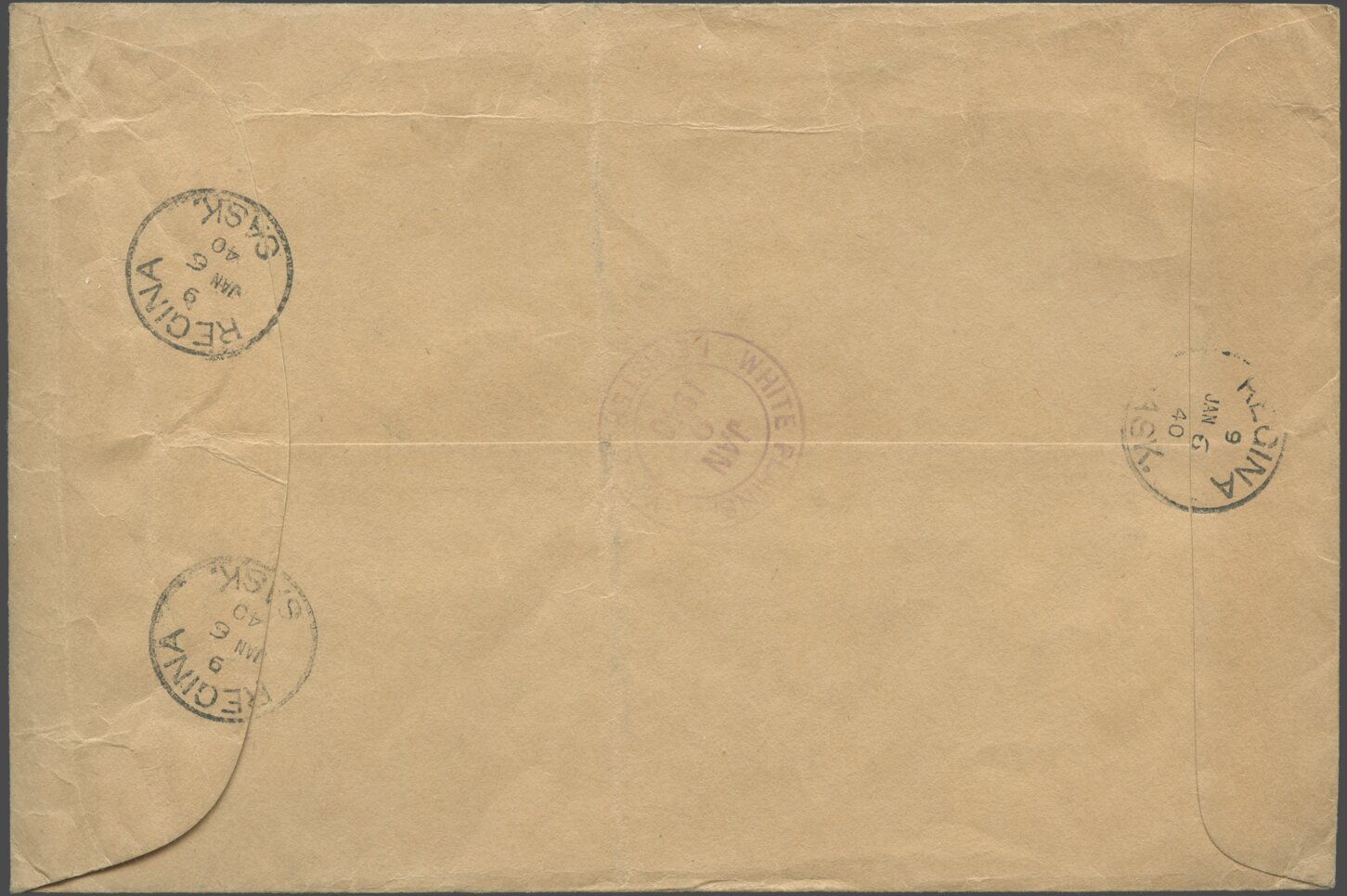 Registered mail sent on January 6, 1940, from Regina, Saskatchewan, Canada, to White Plains, New York, United States. Arrived on January 9, 1940.