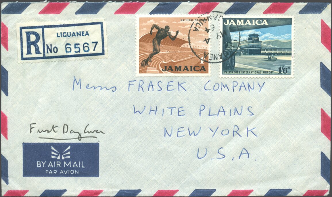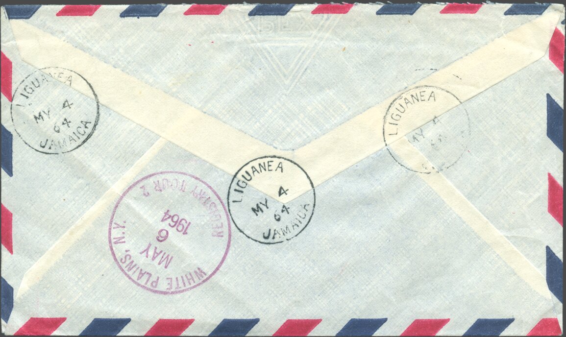 Registered airmail sent on May 4, 1964, from Liguanea (today part of Kingston), Jamaica, to White Plains, New York, United States. Arrived on May 6, 1964.