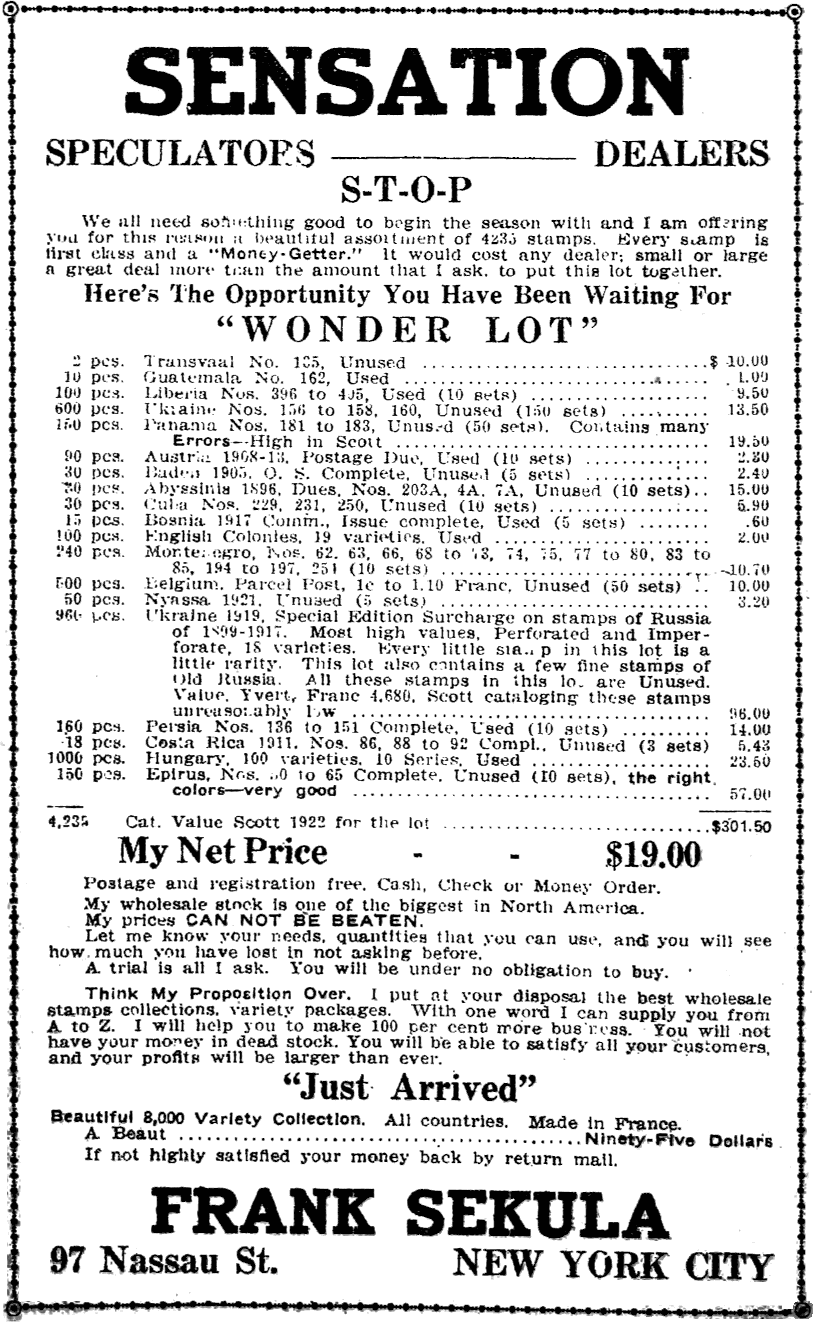 Frasek’s newspaper ads for cheap approvals were everywhere, and Frank Sekula was reportedly the first stamp dealer to also place radio commercials.