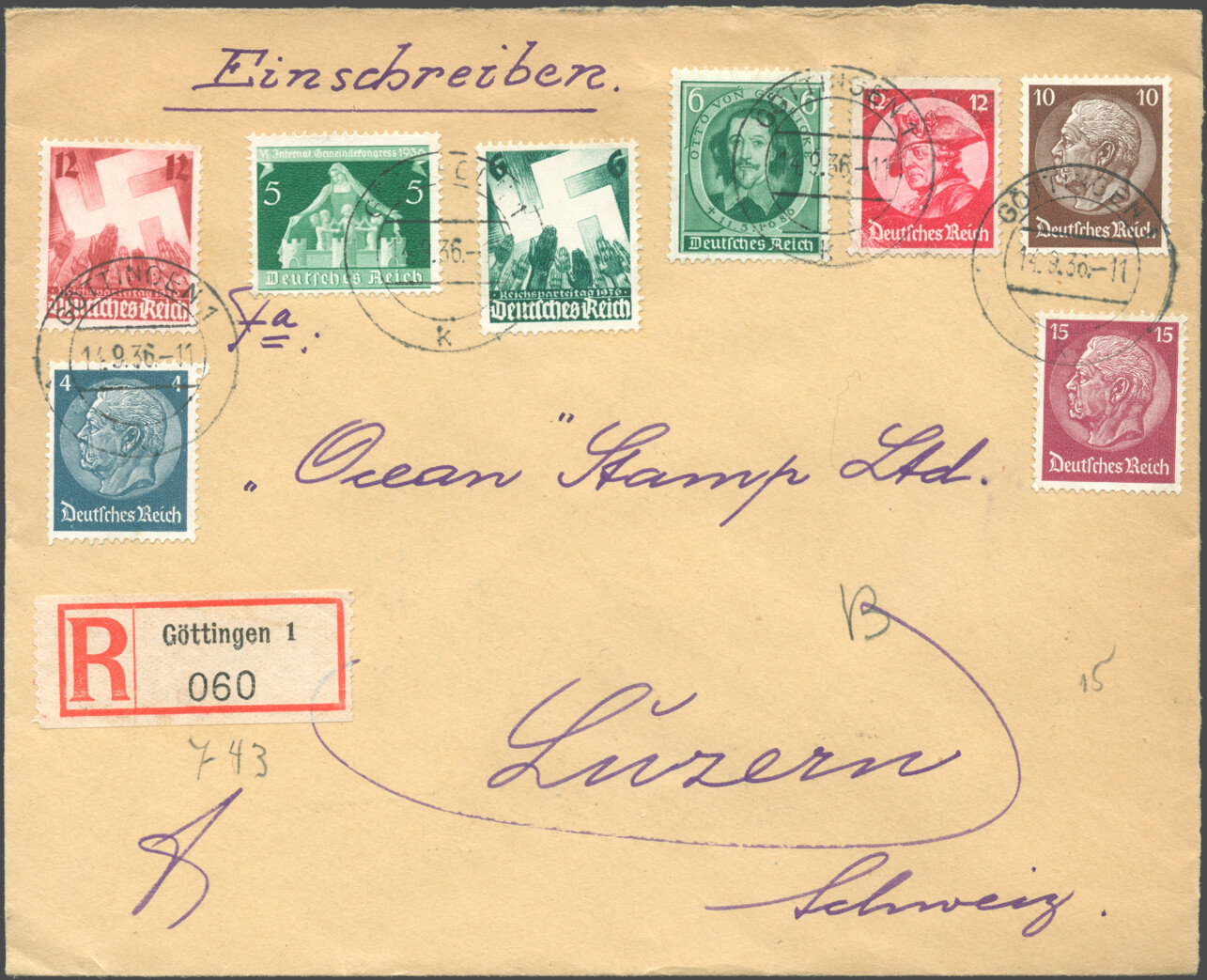 Registered mail sent on September 14, 1936, from Göttingen, Germany, to Lucerne, Switzerland. Arrived on September 14, 1936.