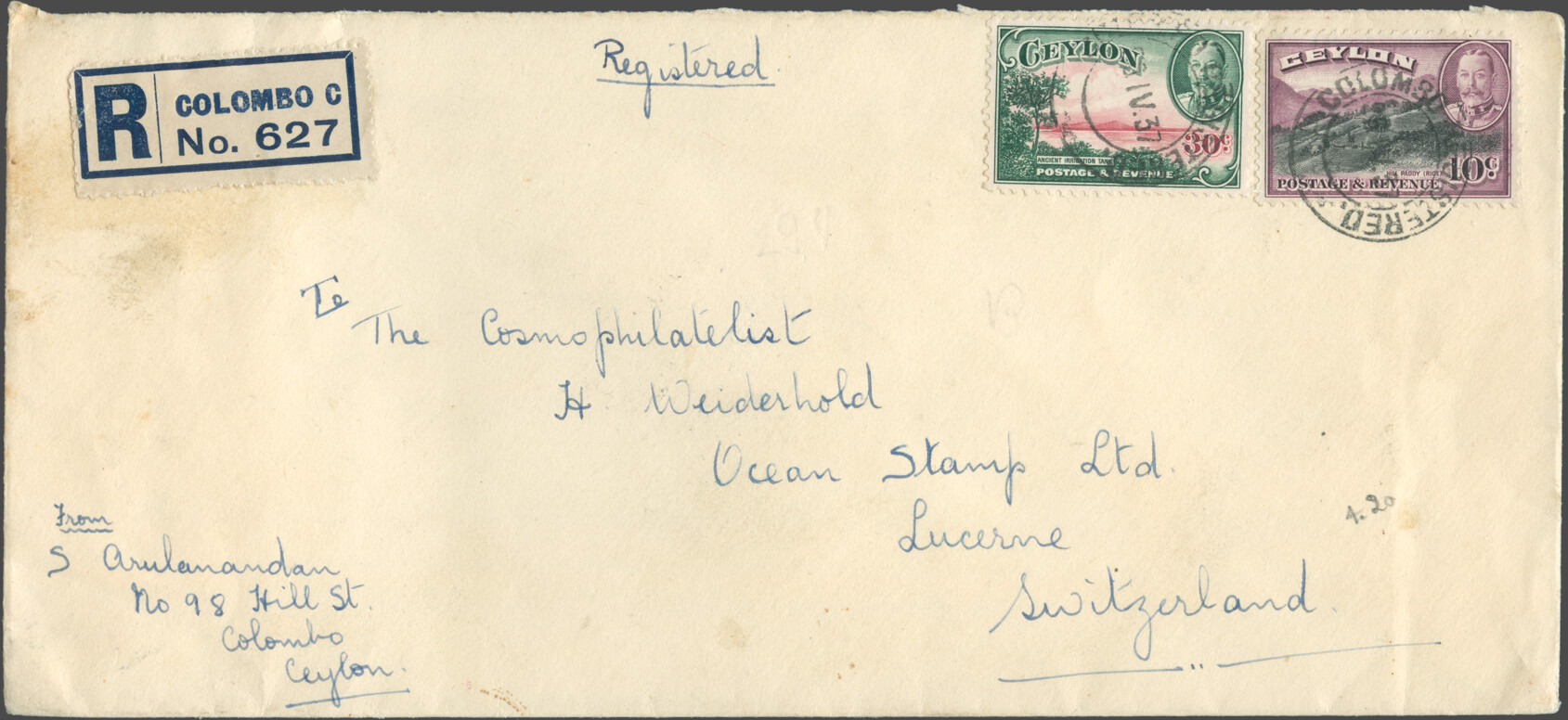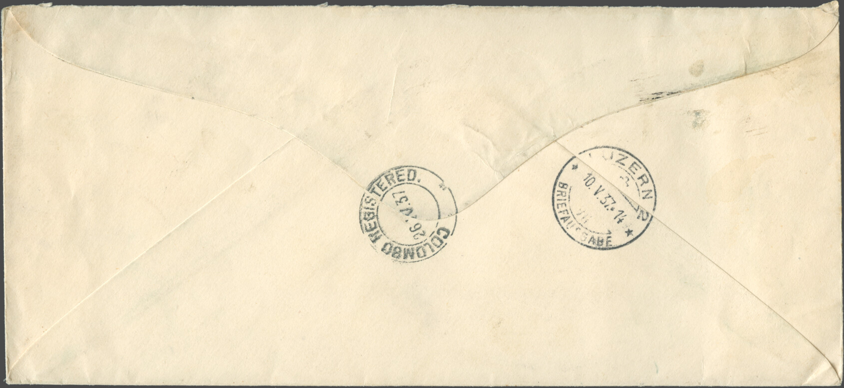Registered mail sent on April 26, 1937, from Colombo, Ceylon (today Sri Lanka), to Lucerne, Switzerland. Arrived on May 10, 1937.