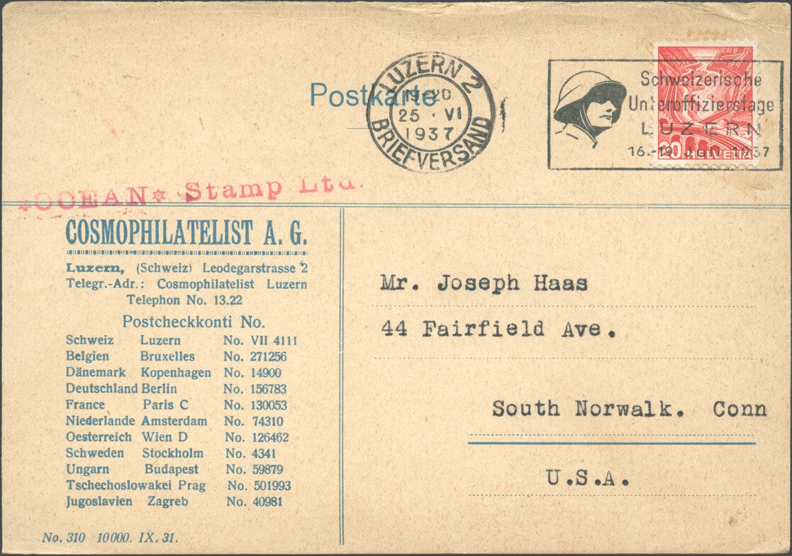 Sent on June 25, 1937, from Lucerne, Switzerland, to South Norwalk, Connecticut, United States.