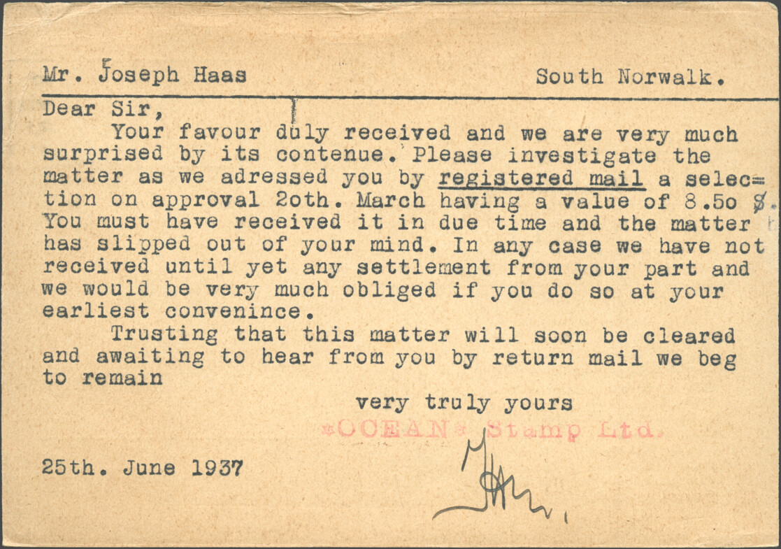When Béla left the board of Cosmophilatelist AG in April 1935 business continued under this name for a couple more months, but in January 1936 the company was re-branded as Ocean Stamp Ltd. with Wiederhold as director — a position he would hold for the next twelve years.