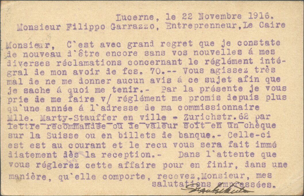 Abgeschickt am 22. November 1916, von Luzern, Schweiz, nach Kairo, Ägypten.