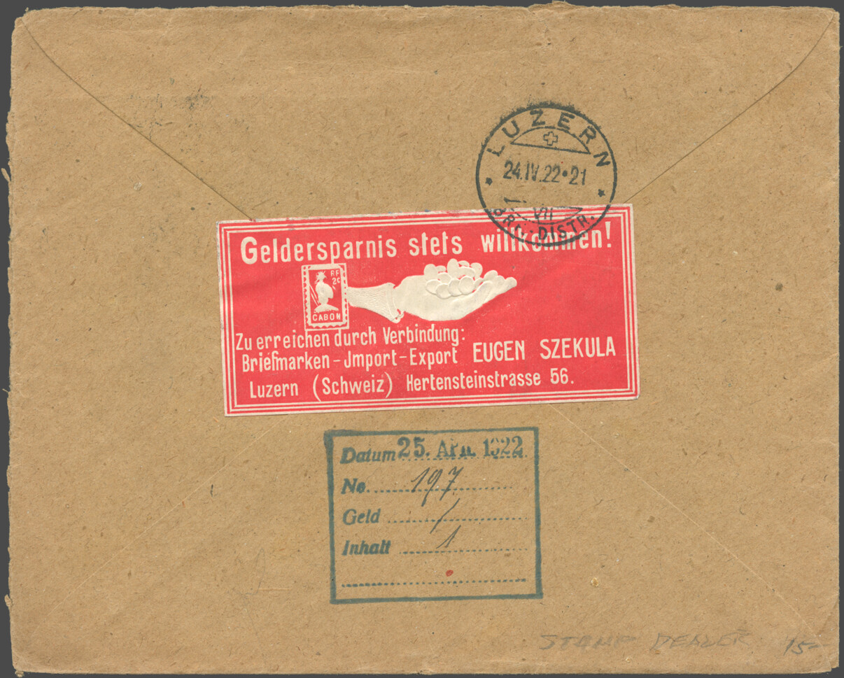 Sent on February 15, 1921 with shipment from Leipzig, Germany, to Eugen Szekula in Lucerne.