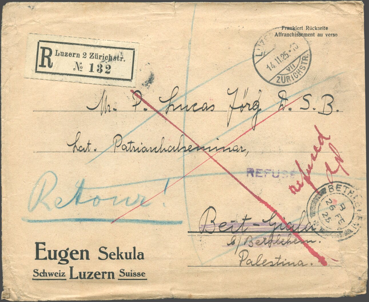 Registered mail sent on February 10, 1922, from Lucerne, Switzerland, to Copenhagen, Denmark. Acceptance refused and returned on February 21.