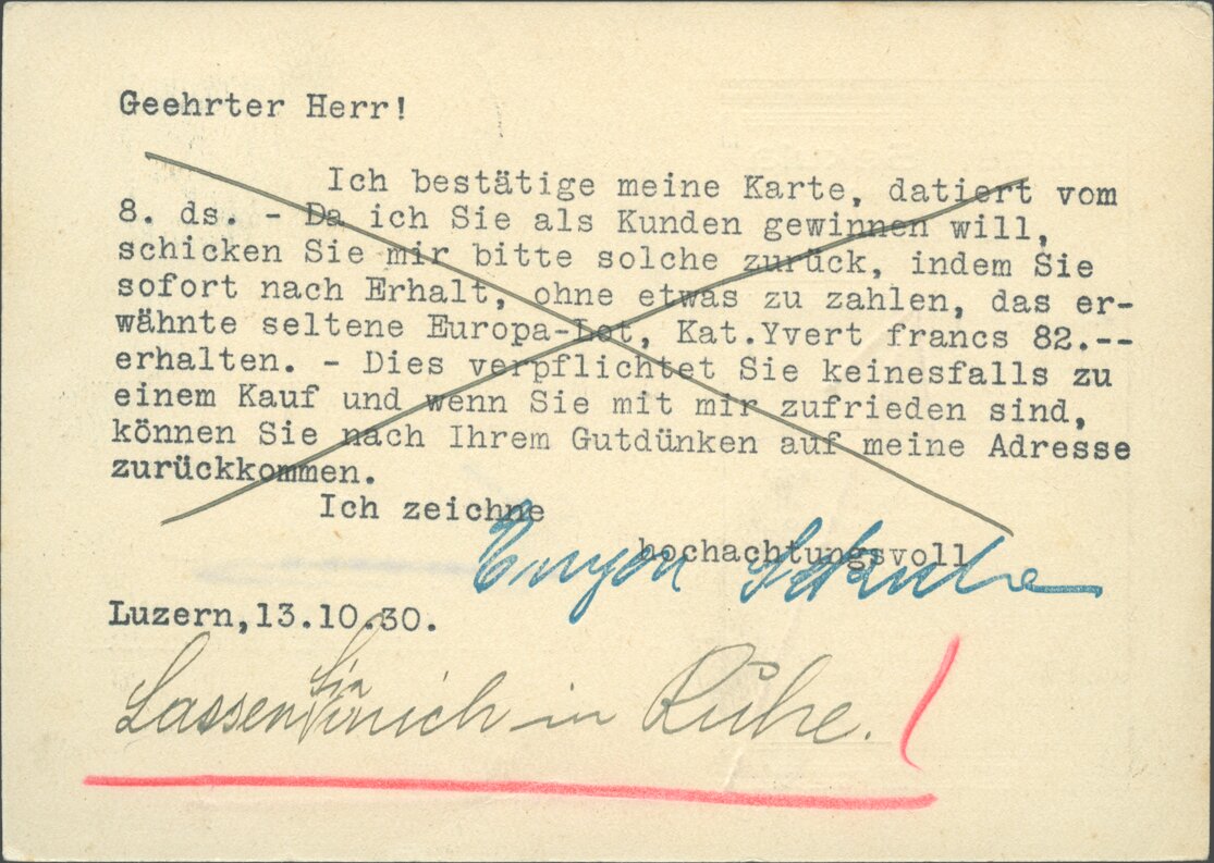 A failed attempt to establish his own postage paid labels in the Swiss postal system in 1930 shows that he was similarly creative, but he also employed the same sale tactics as Béla sending out unwanted stamp selections and then aggressively demanding payment – eventually with the same result: