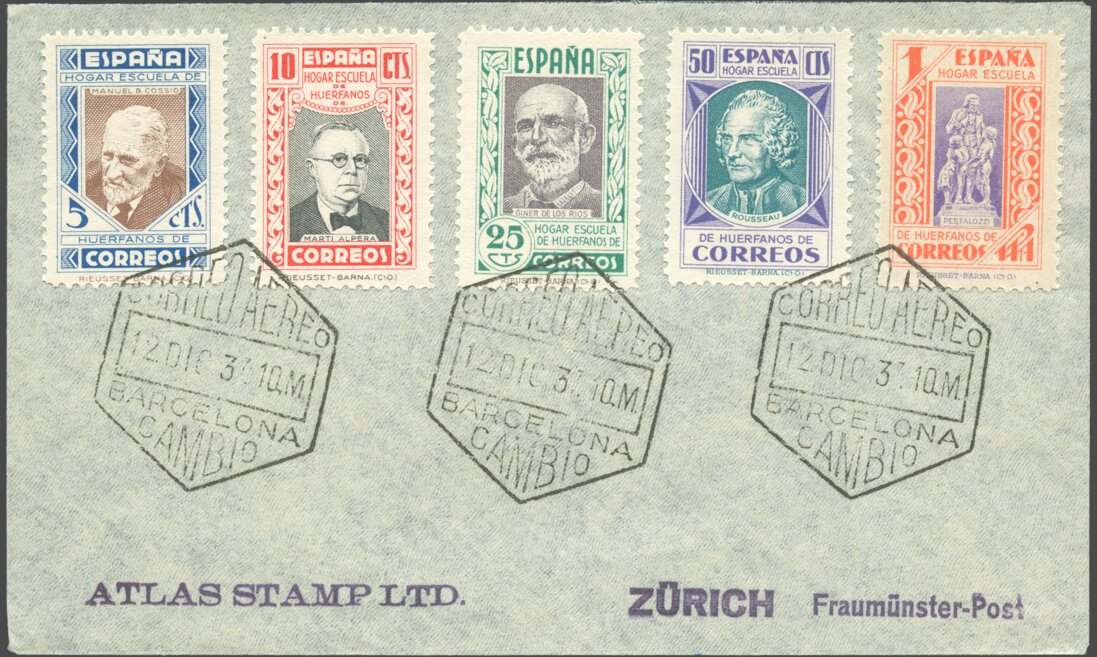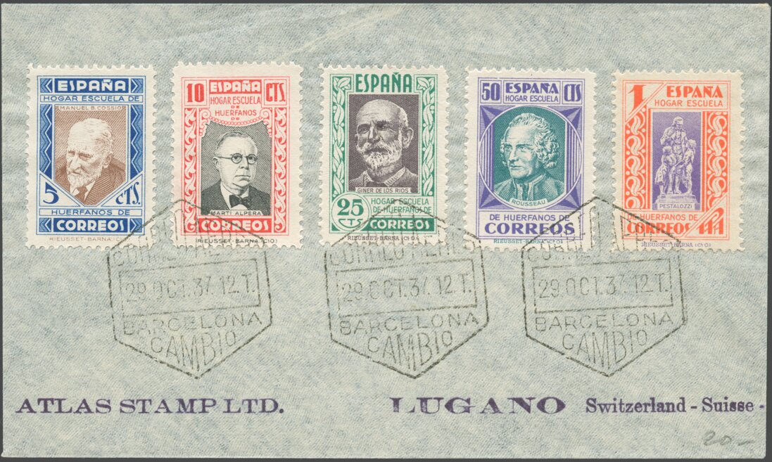 Two philatelic covers franked with Spanish charity labels, postmarked in Barcelona, Spain; first one on October 29, 1937, and addressed to Atlas Stamp Ltd., Lugano, Switzerland, the other one dated December 12, 1937, and addressed to Zurich where Atlas Stamp had moved in November.