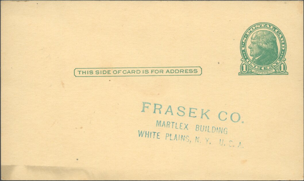 A trade note that appeared in various philatelic magazines and daily newspapers hinted at the future size of the company: The Frasek company, long known as one of the larger stamp dealers of the world, has moved its headquarters from Lugano, Switzerland, to White Plains, N. Y. At present the company employs a staff of almost fifty men and women and will require perhaps triple that number when it completes the shipment of its stock from Switzerland.